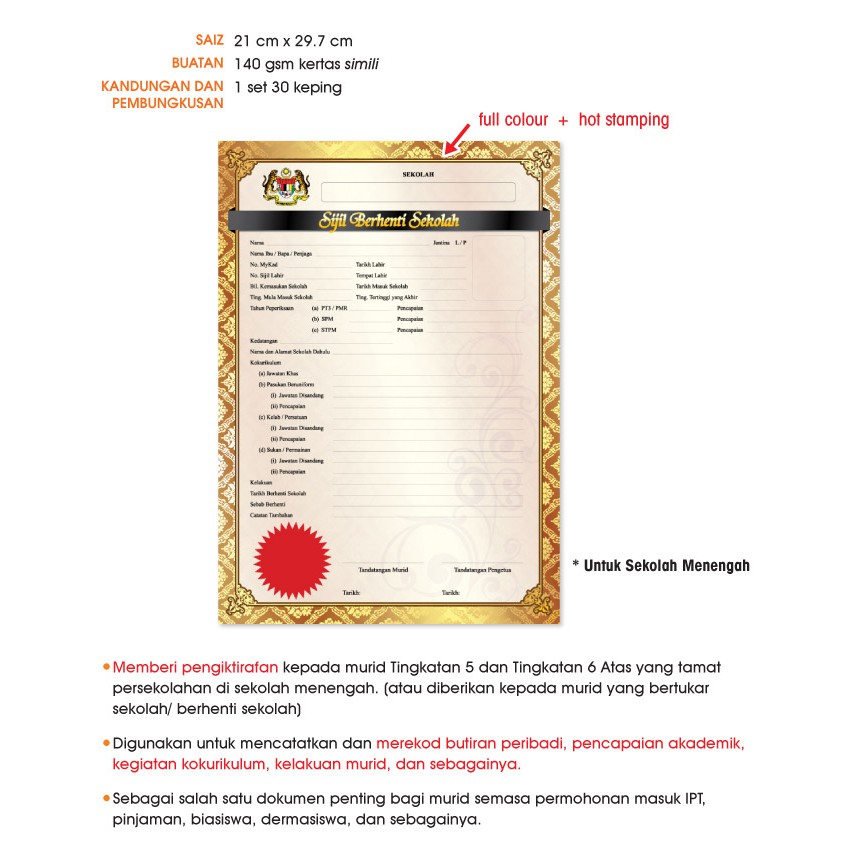 Contoh Sijil Berhenti Sekolah. 2011 version baru 1. Telah tamat persekolahan sehingga tingkatan 5.