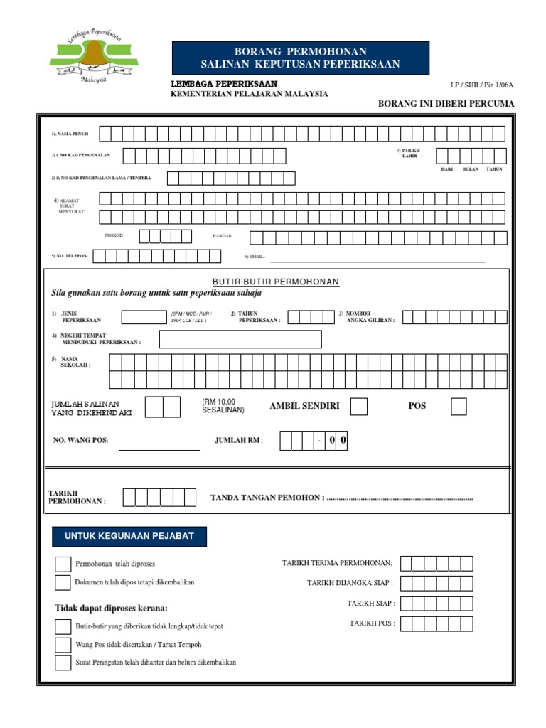By Admin Kerjaya February 23 2021 Sijil keputusan Penilaian Menengah Rendah PMR Sijil Peperiksaan Malaysia SPM dan lain-lain lagi adalah amat penting dalam mengisi borang pekerjaan atau untuk melanjutkan pelajaran ke menara gading. Pemohon mohon sijil peperiksaan baru boleh membuat permohonan melalui pos dengan cara menghantar Borang Permohonan Salinan Keputusan LPSIJILPin 106. Pihak tuanpuan boleh mengisi borang permohonan ke Lembaga Peperiksaan untuk mendapatkan salinan sijil LCE SRP PMR MCE dan SPM tersebut.