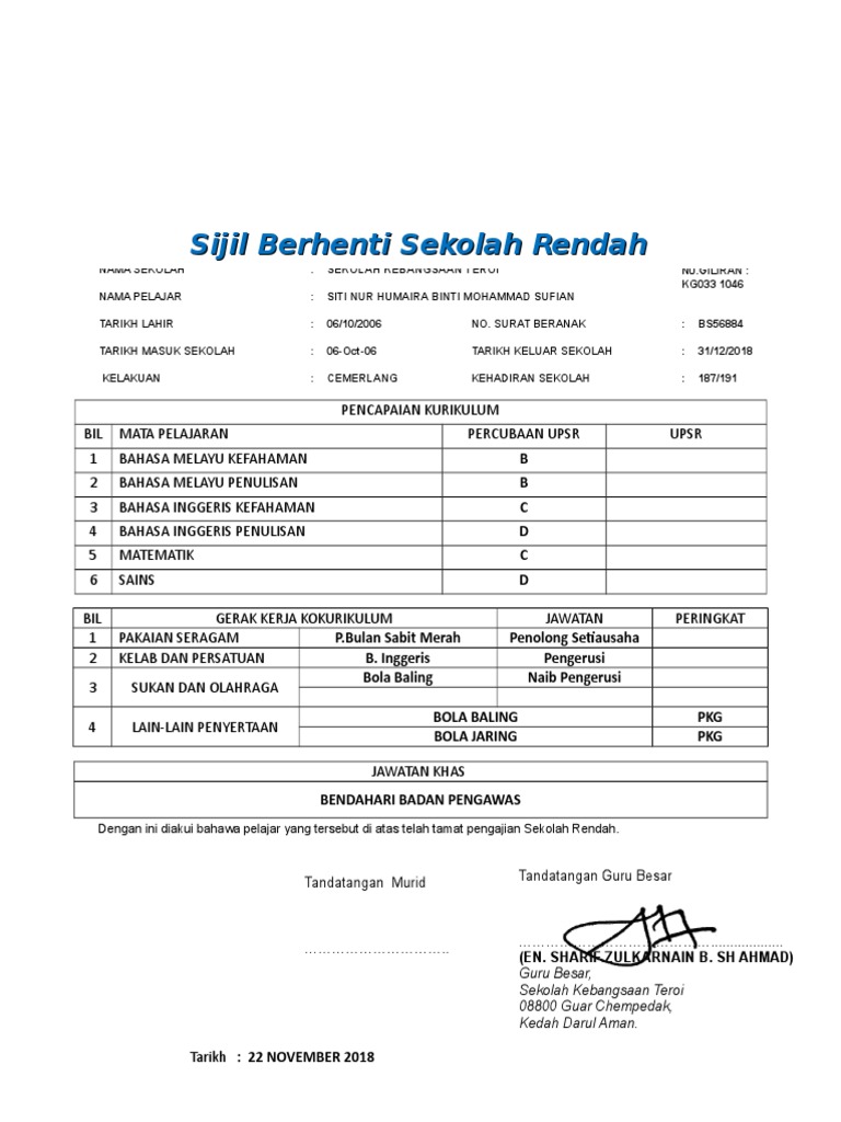 Copy of template sijil berhenti sekolah. Tapak asal sekolah ini terletak di hadapan Sekolah Rendah Bantuan Chung Hua Tatau iaitu di. Sijil Kelahiran Murid Sijil Pengangkatan b.