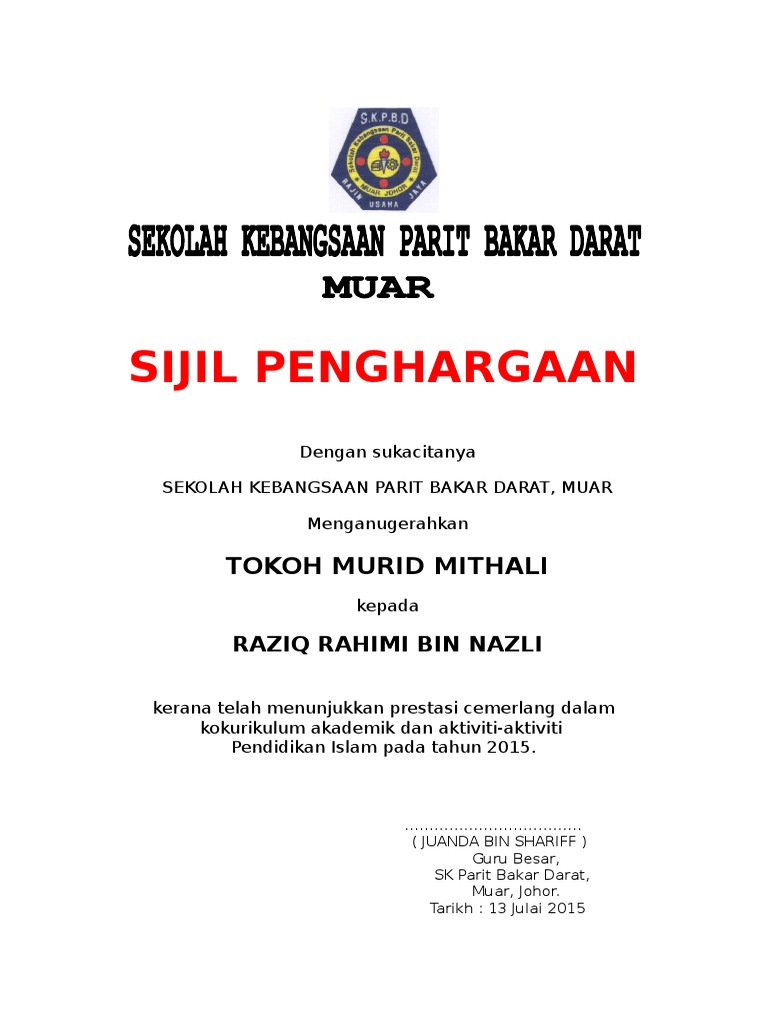 Sebagai contohnya bacaan doa bersempena dengan Hari Anugerah Kecemerlangan di sekolah. Boleh edit sendiri untuk sijil penghargaan sekolah pengawas penceramah dan banyak lagi. Sijil Penghargaan Dengan ini disahkan bahawa NUR ATHIRAH BINTI MOHD SUHAIMI 960000-00-0001 menerima ANUGERAH PELAJAR TERBAIK KURIKULUM ALIRAN SAINS AGAMA sempena MAJLIS GRADUASI 2013.