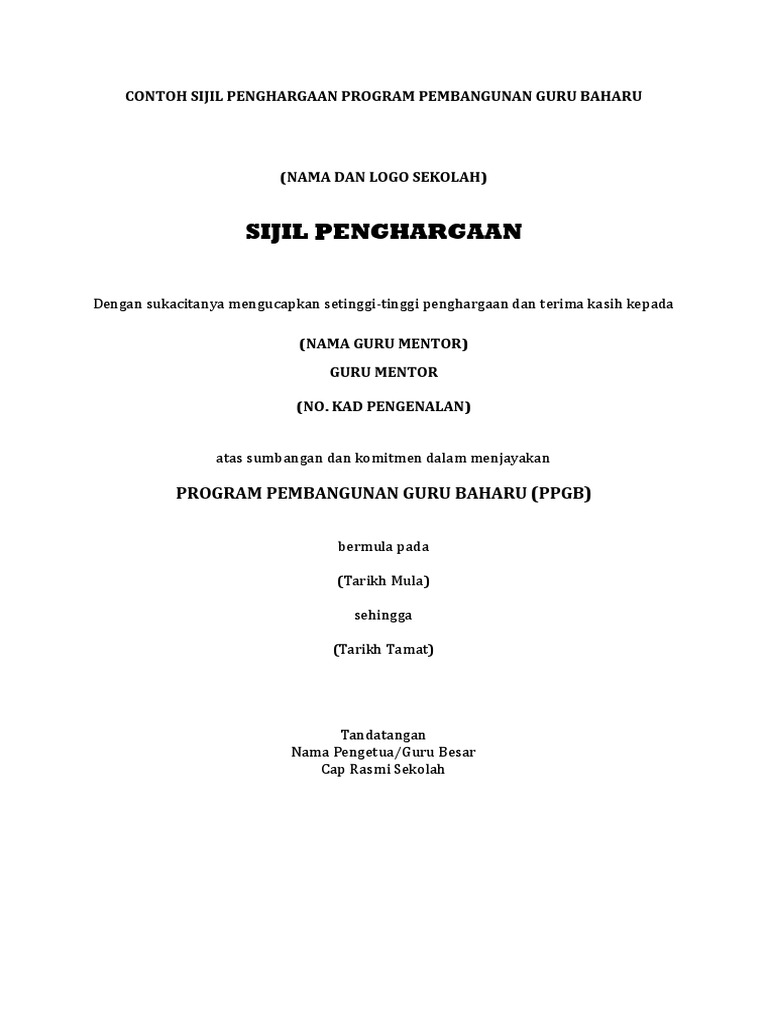 PPGB atau juga lebih dikenali sebagai Program Pembangunan Guru Baharu adalah suatu program di bawah kelolaan Bahagian Pendidikan Guru BPG. Nov 15 2018 - Contoh Sijil Penghargaan. Kerja kursus seni visual 2012 1.