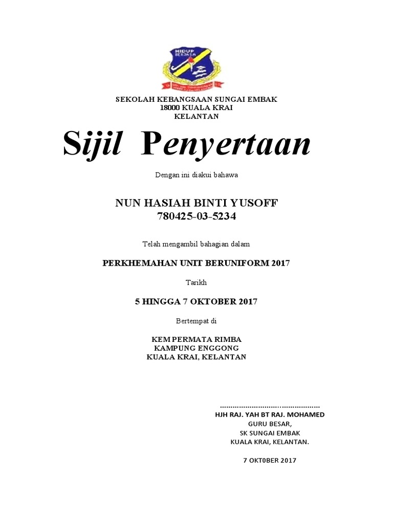 Template sijil perkhemahan unit beruniform. Selaras dengan dasar tersebut guru-guru dan murid-murid juga dibenarkan menyertai aktiviti seperti perkhemahan perbarisan dan kursus yang dianjurkan dari semasa ke semasa oleh agensi-agensi kerajaan atau oleh pertubuhan bukan kerajaan yang berdaftar. Perniagaanoperasi sijil-sijil pendaftaran syarikat penyata bank memorandumperjanjian dan lain-lain yang berkaitan. Semua pelajar diwajibkan memakai pakaian seragam unit beruniform masing-masing.